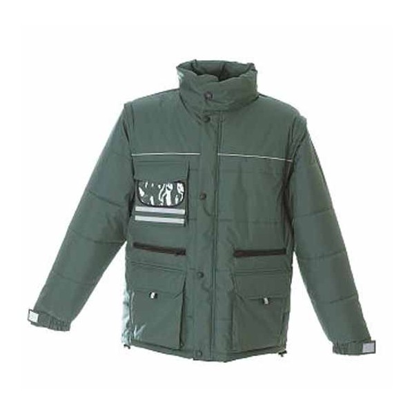 GIUBBOTTO AMERICA GREEN - MANICHE STACCABILI - POLIESTERE SPALMATO IN PVC - IMBOTTITO IN POLIESTERE CON FODERA IN POLIESTERE - TESSUTO ESTERNO ANTISTRAPPO, TRASPIRANTE, IMPERMEABILE - TASCA SUL PETTO CON PORTABADGE A SCOMPARSA - DUE TASCHE ESTERNE CON ZIP - UNA TASCA INTERNA - DUE TASCHE CON PATTA E VELCRO - CAPPUCCIO ESTRAIBILE DA COLLETTO - TAGLIA - M - L - XL - XXL - 3XL